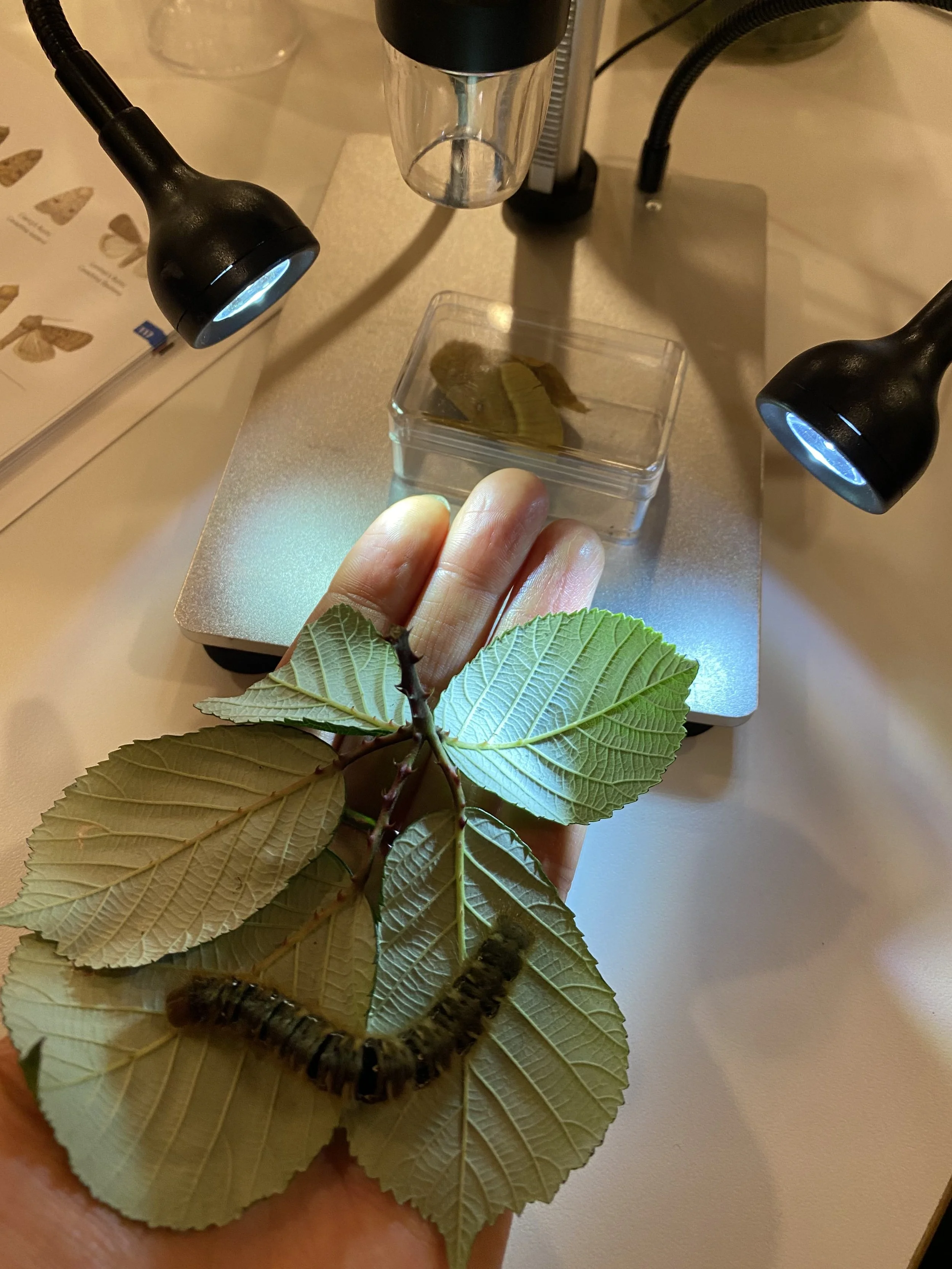 The digital microscope was also on hand to look up close at the moth specimen brought in by Butterfly Conservation. We saw Arctia caja (garden tiger moth) and Lasiocampa quercus (oak eggar moth) at various stages of life (egg, caterpillar, pupa, and adult). We also combed through many guidebooks to get a better sense of the variety and beauty of the UK’s moth species.