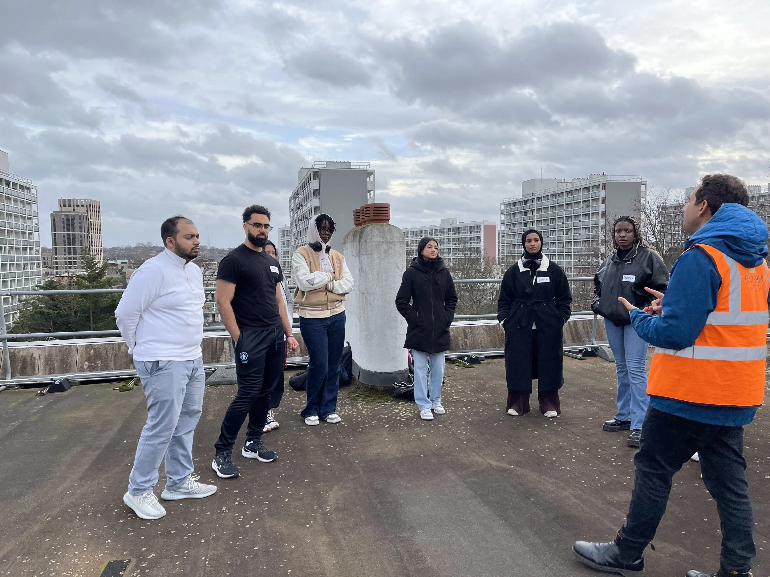 On a steely winter day in February, trainees meet for the first time on the roof of Elmore House in Brixton, the site of Brixton Energy Solar 1. This is the UK’s first inner-city, co-operatively owned renewable energy project on a social housing estate. Trainees learn about the history of the project and receive an introduction to the world of community energy.