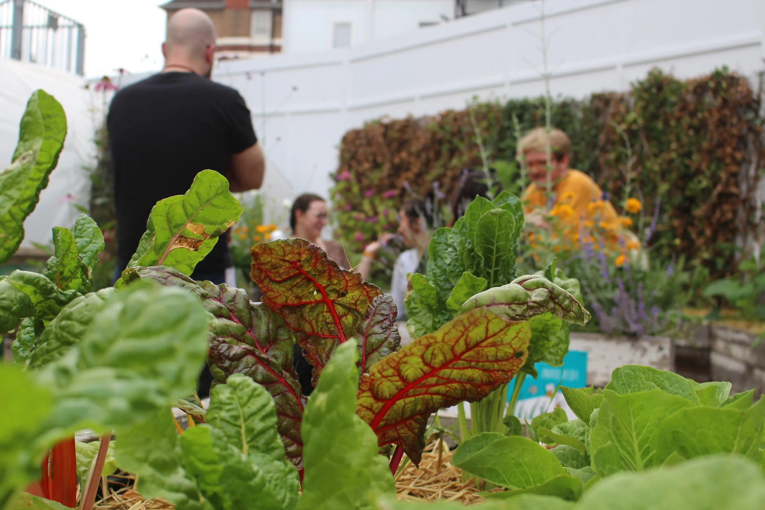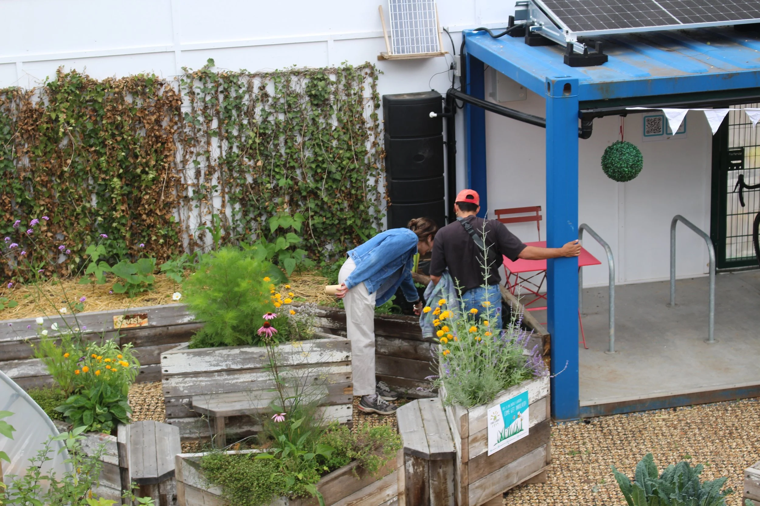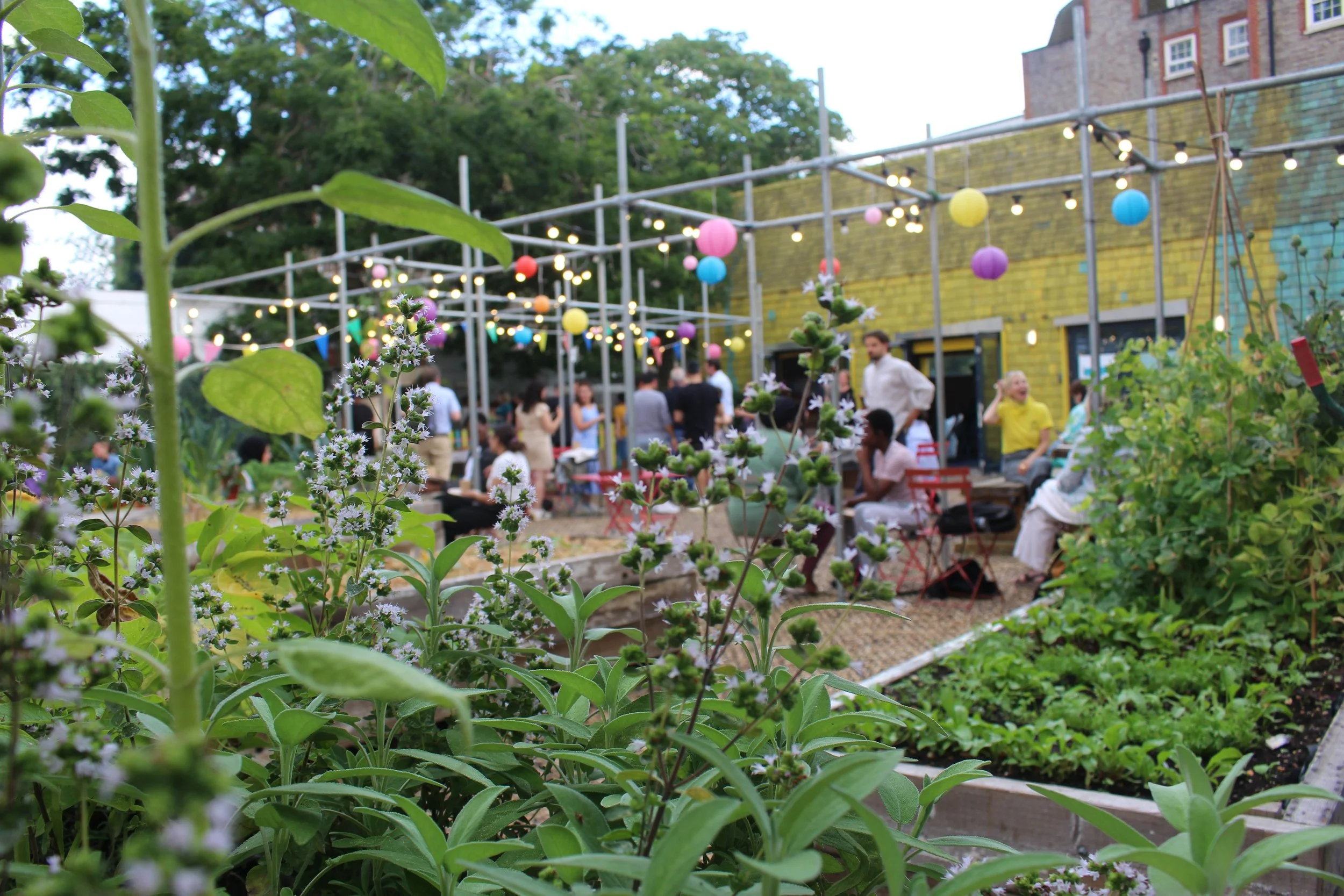 This garden can be found in the courtyard behind our office at Ebury Edge in Pimlico. Tucked away from the bustle of the area, this exciting growing space is comprised of raised beds and a greenhouse. We used reclaimed materials from a neighbouring construction site for much of the building process and we will continue to add to the space with more beds, benches. We recently added cool new features, including a mini wildlife pond, a green wall and an air quality baffle. They join the cob pizza oven, solar-powered irrigation system. It’s becoming a testing ground for simple technologies that can improve local health and wellbeing.