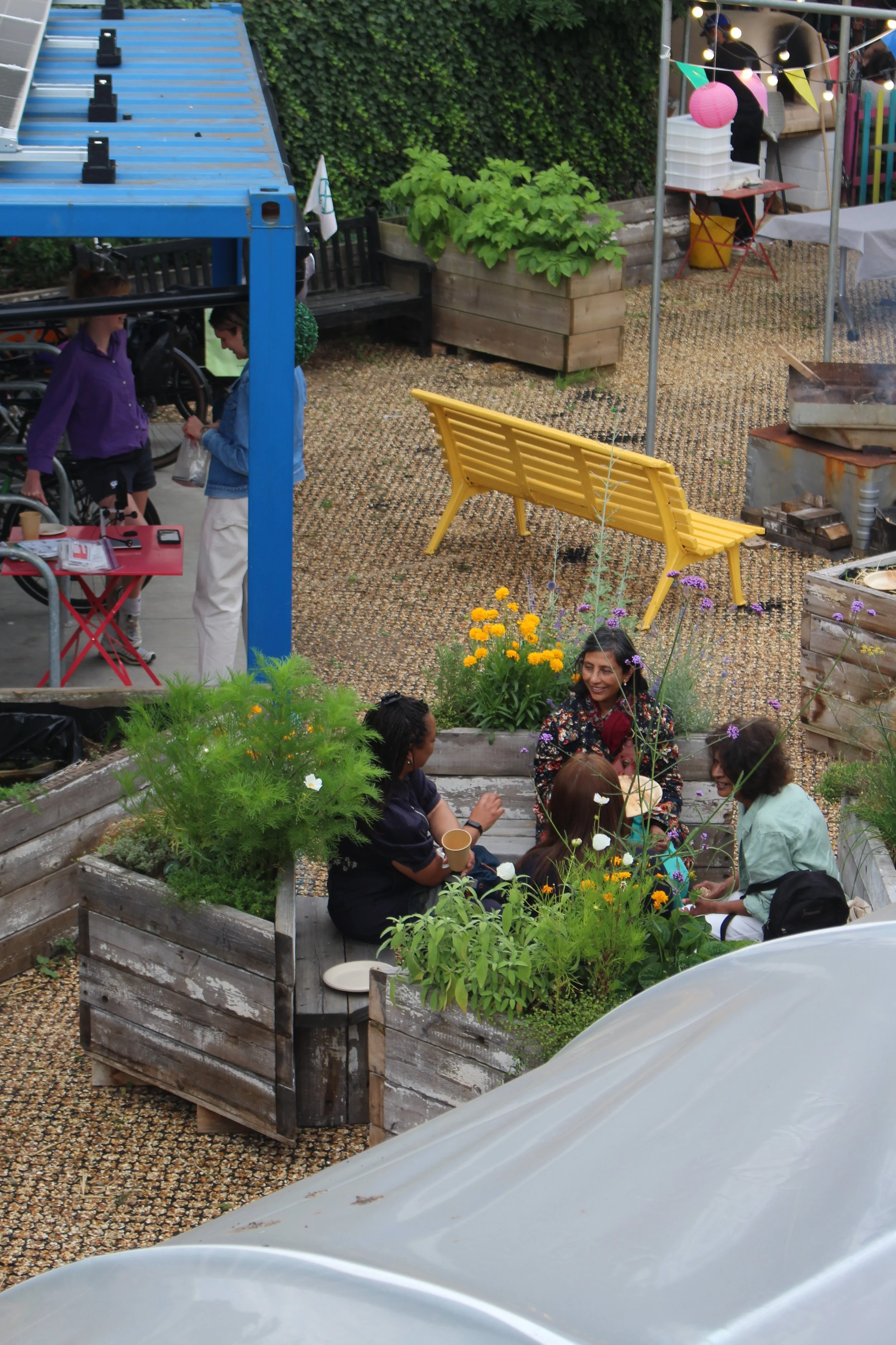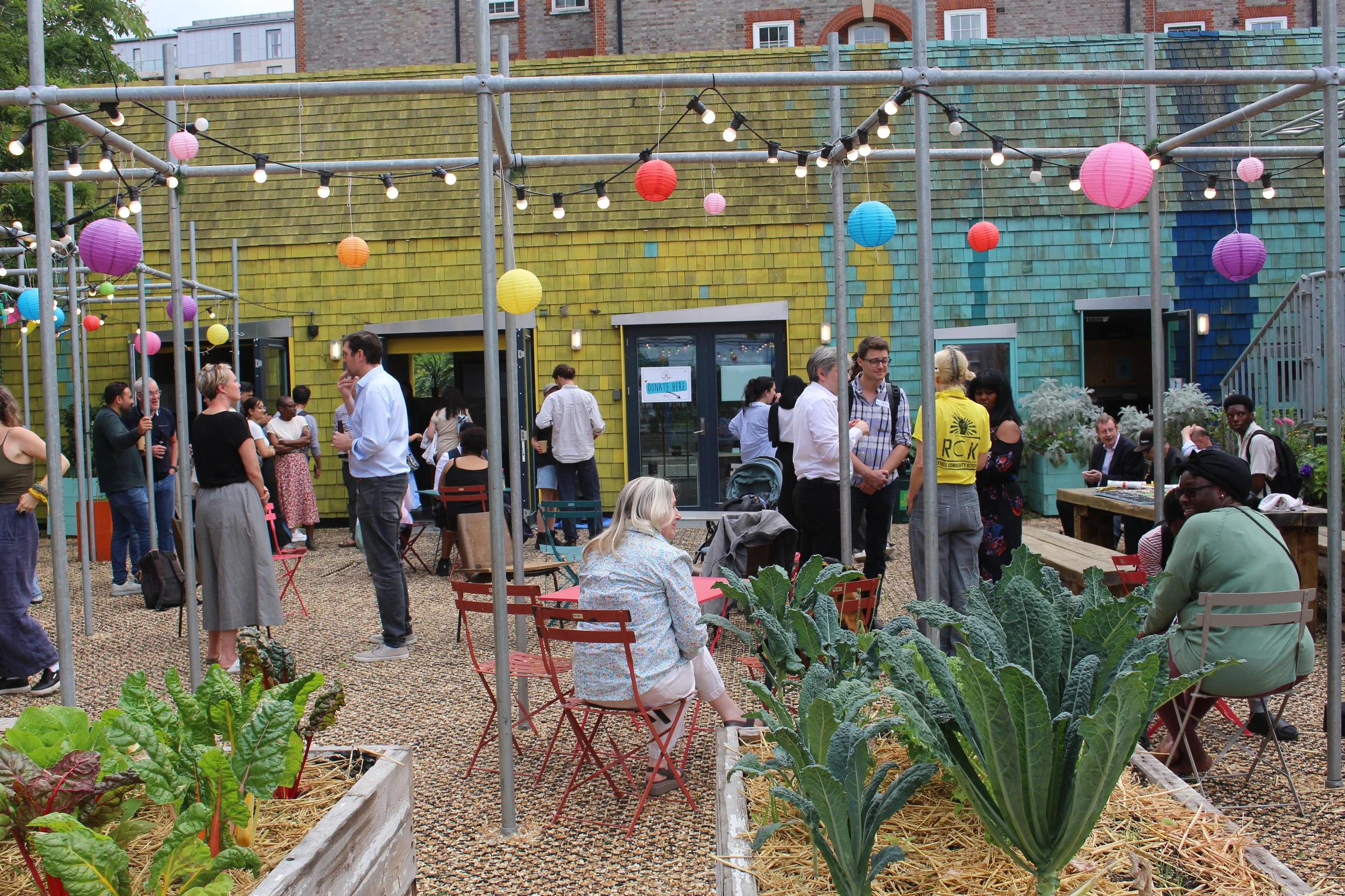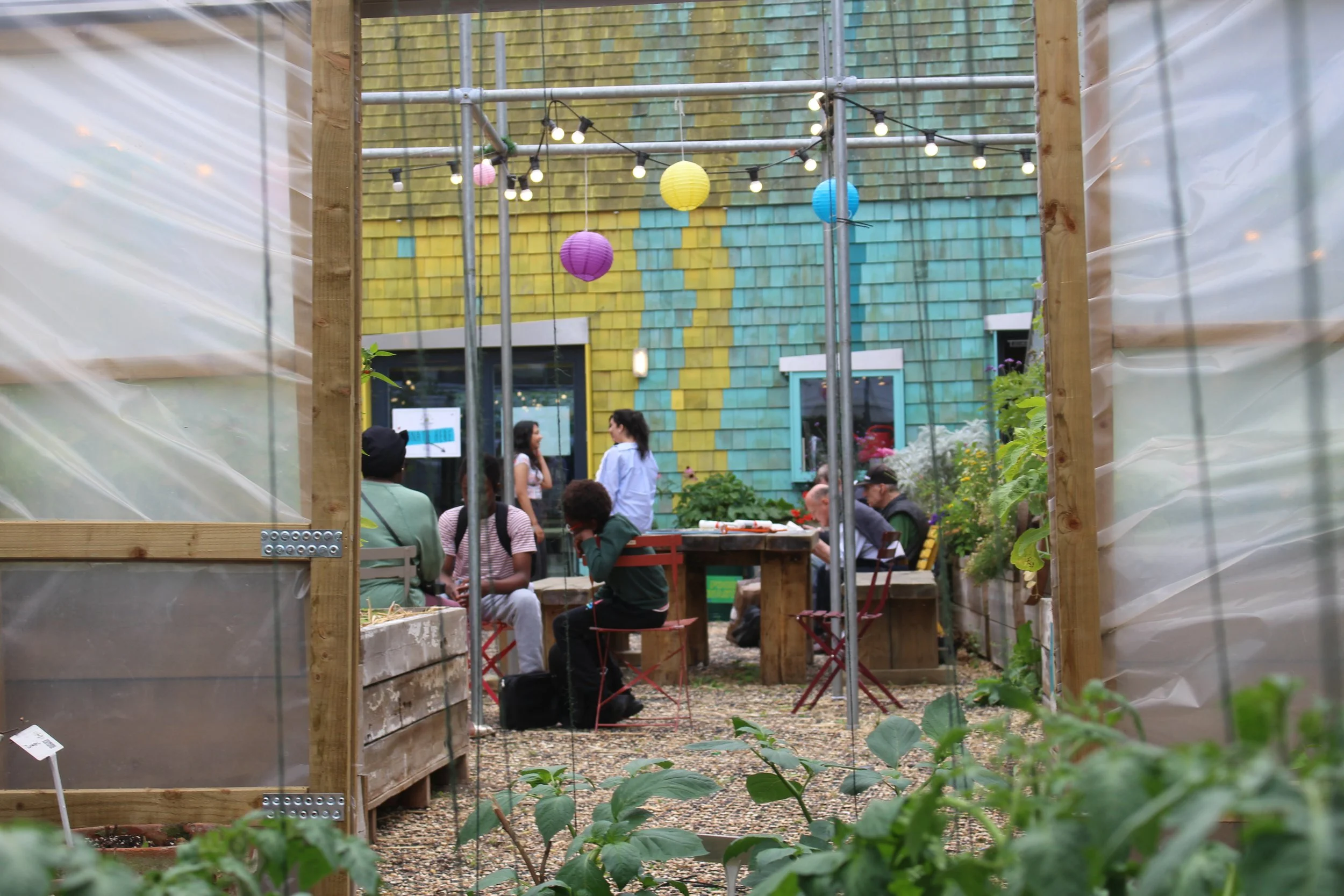 This garden can be found in the courtyard behind our office at Ebury Edge in Pimlico. Tucked away from the bustle of the area, this exciting growing space is comprised of raised beds and a greenhouse. We used reclaimed materials from a neighbouring construction site for much of the building process and we will continue to add to the space with more beds, benches. We recently added cool new features, including a mini wildlife pond, a green wall and an air quality baffle. They join the cob pizza oven, solar-powered irrigation system. It’s becoming a testing ground for simple technologies that can improve local health and wellbeing.
