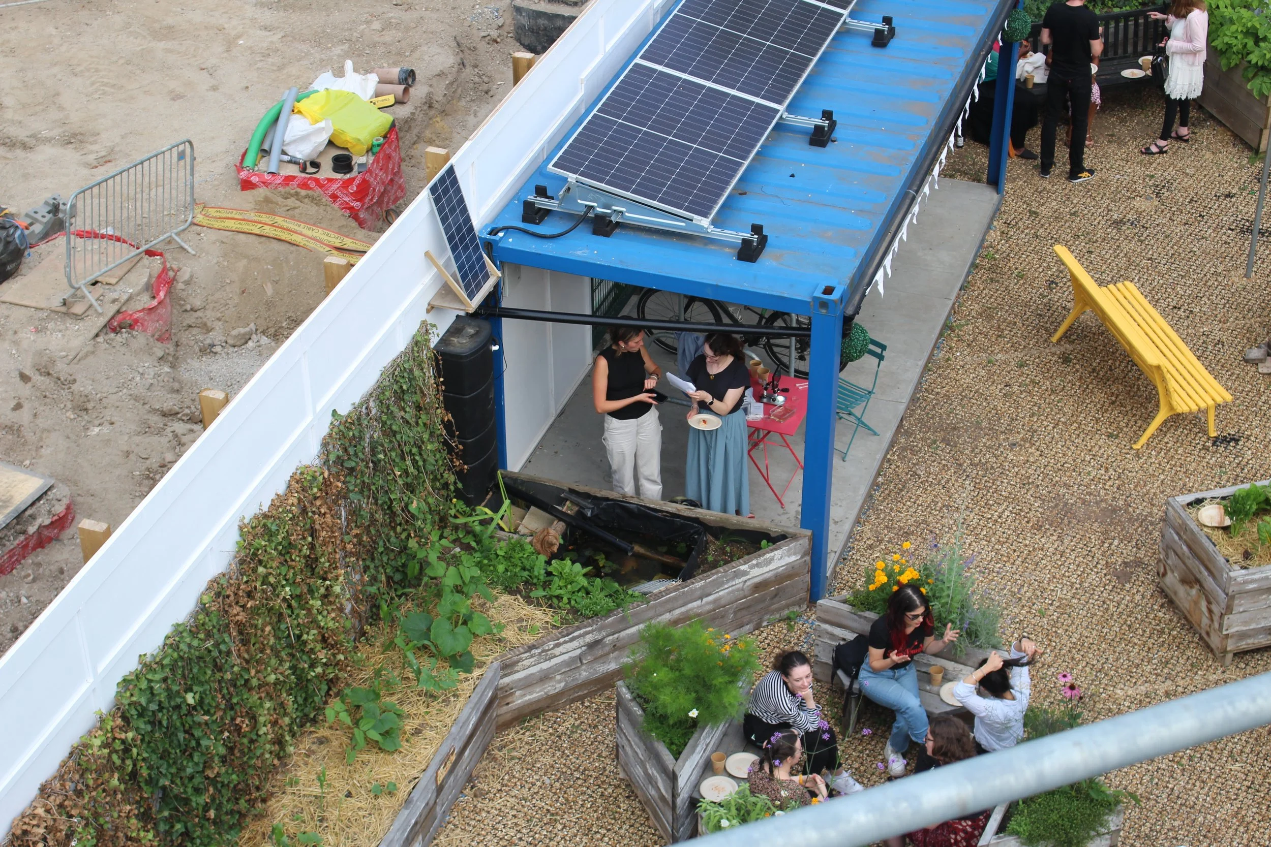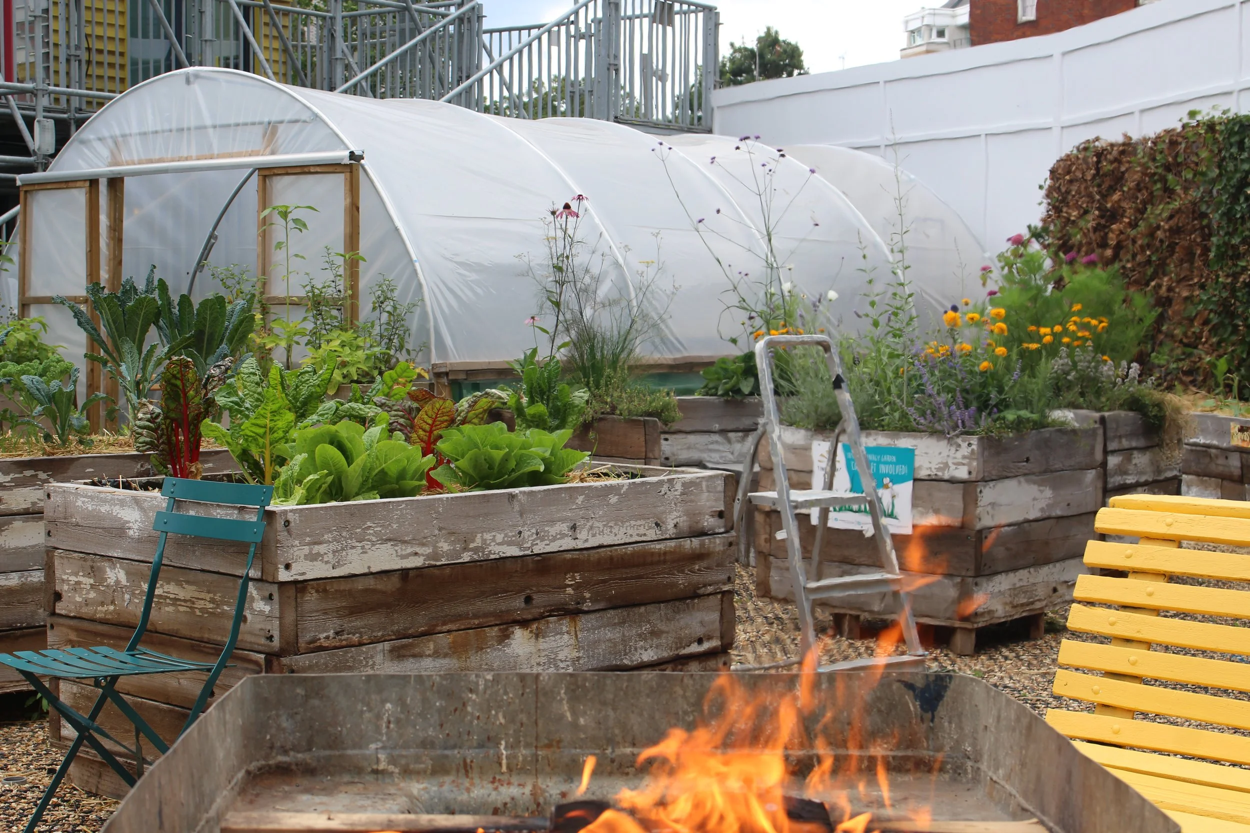 Built elements: Planters, greehouse, fire pit, pizza oven, solar panels, water butts, green wall, air quality baffle