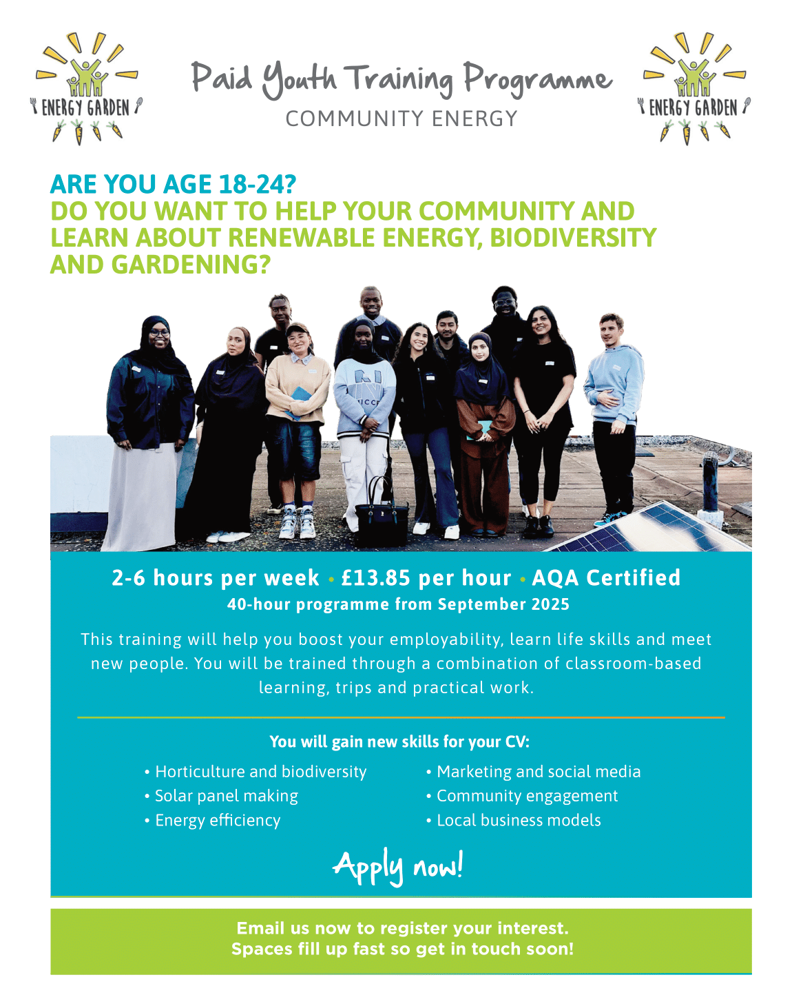 The traineeship is paid at London Living Wage and AQA-certified. Young adults across London will gain valuable experience in cooperative business practices, environmental technology, communications, and community development.